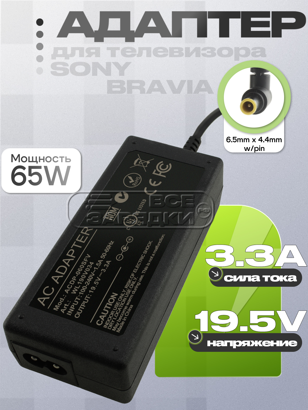 Адаптер (блок) питания 19.5V, 3.3A, 65W, 6.5mm x 4.4mm (VGP-AC19V44, ACDP-060S01, ACDP-060SFV), для телевизора Sony Bravia, зарядное устройство для ноутбука Sony Vaio