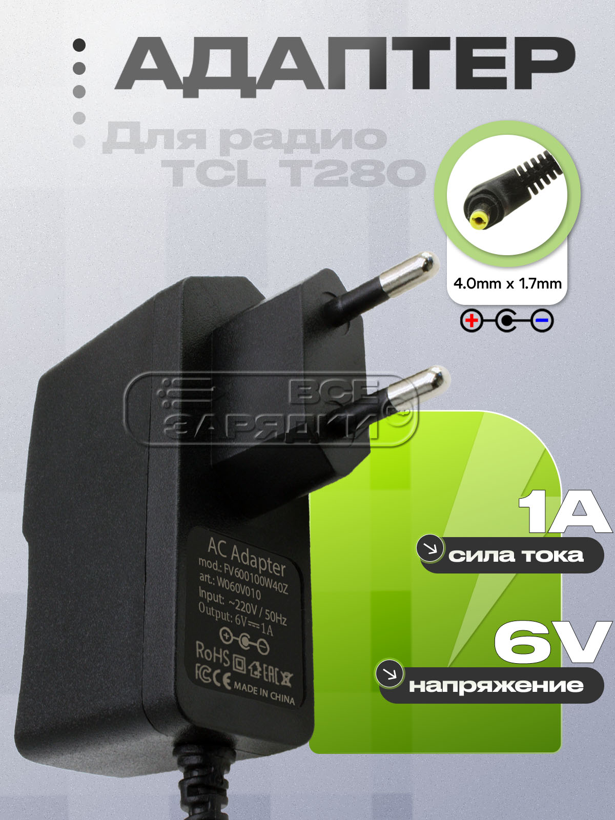 Адаптер (блок) питания 6V, 1A, 6W, 4.0mm x 1.7mm (FV600100W40Z), отрицательная (обратная) полярность, для радиоприемника TCL T280 и др. устройств