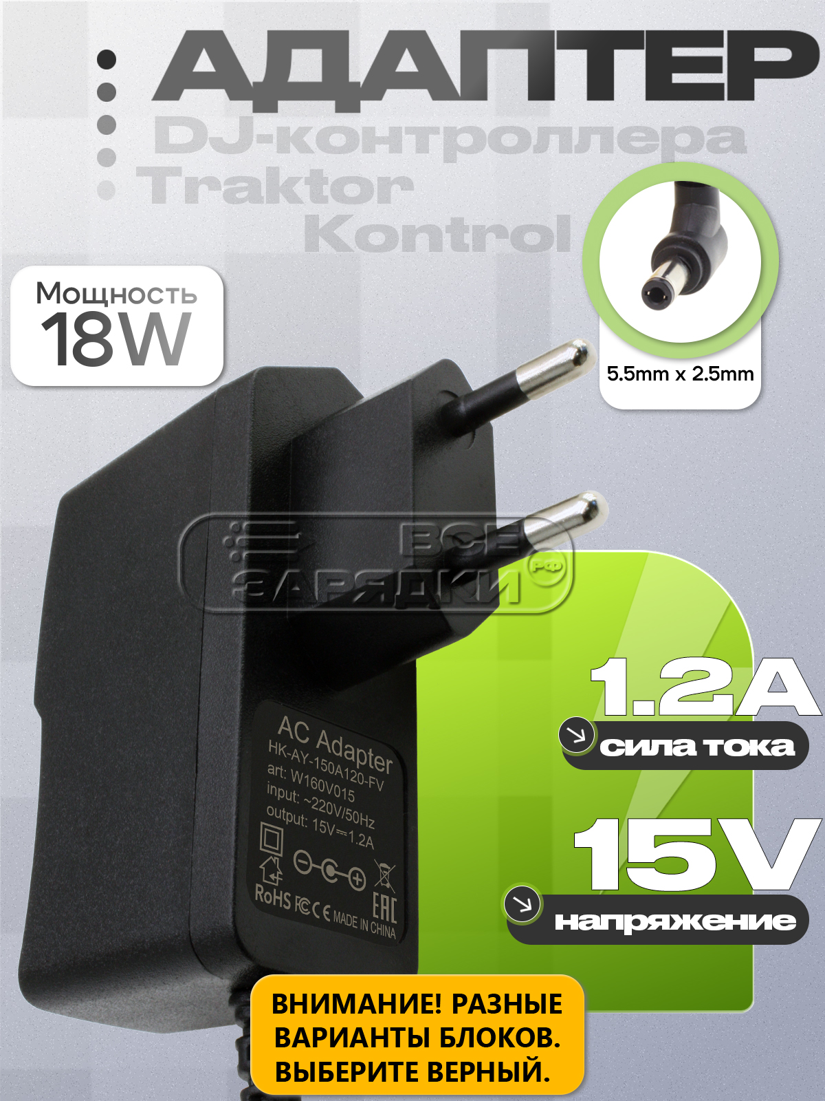 Адаптер (блок) питания 15V, 1.2A, 18W, 5.5mm x 2.5mm (HK-AY-150A120-CP, HK-AY-150A120-FV) для DJ-контроллера Native Instruments Traktor Kontrol Z1, Traktor Kontrol S-серий и др.