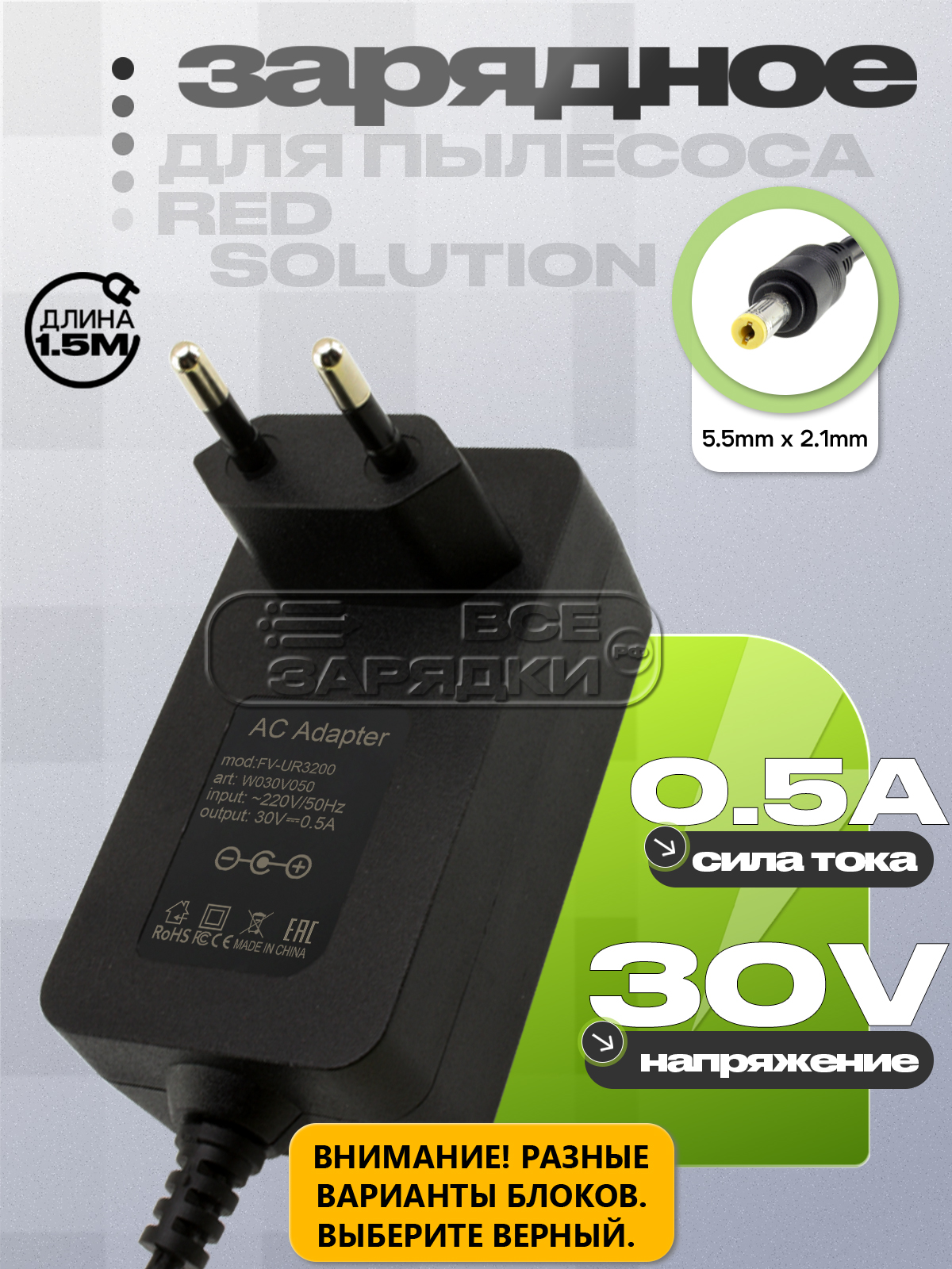 Адаптер (блок) питания 30V, 0.5A, 5.5mm x 2.1mm (RV-UR3200, FV-UR3200),1.5m, для зарядки беспроводного аккумуляторного пылесоса RED SOLUTION RV-UR3200, RV-UR3100 и др