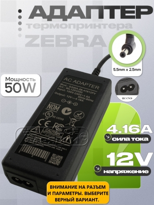 Адаптер (блок) питания 12V, 4.16A, 50W, 5.5mm x 2.5mm (SAWA-56-41612A, SAWA-56-41612FV), IEC C8, для принтера Zebra и др. устройств