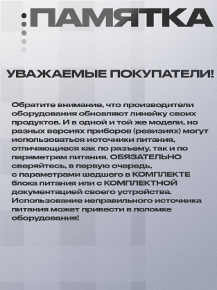 Обратите внимание, что производители оборудования обновляют линейку своих продуктов. И в одной и той же модели, но разных версиях приборов (ревизиях) могут использоваться источники питания, отличающиеся как по разъему, так и по параметрам питания. ОБЯЗАТЕЛЬНО сверяйтесь, в первую очередь, с параметрами шедшего в КОМПЛЕКТЕ блока питания или с КОМПЛЕКТНОЙ документацией своего устройства. Использование неправильного источника питания может привести в поломке оборудования!