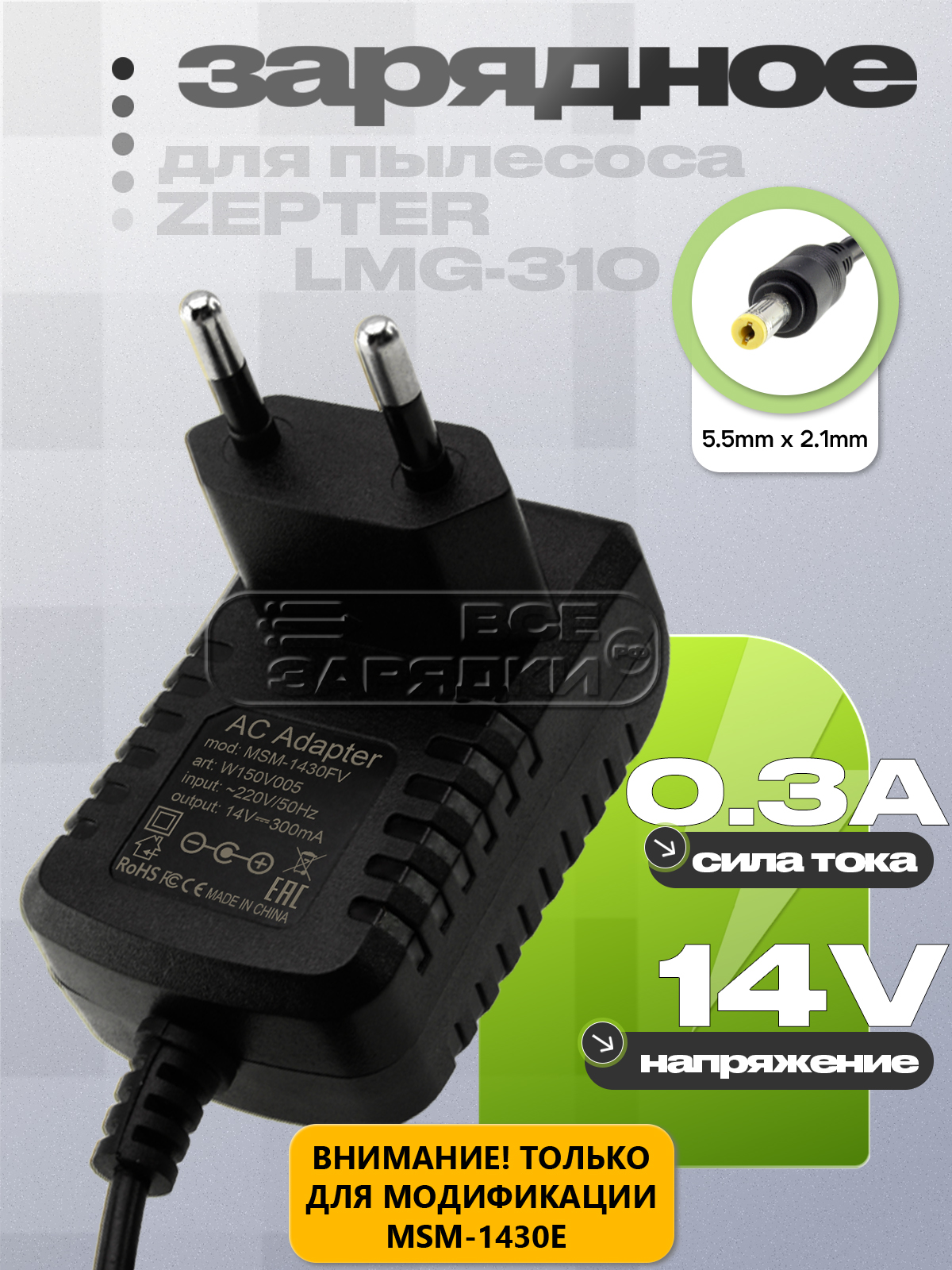 Адаптер (блок) питания 14V, 0.3A, 5.5mm x 2.1mm (MSM-1430E, MSM-1430FV), зарядное устройство для пылесоса Zepter LMG-310 (MSM-1430E)