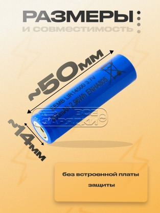 Аккумуляторная батарея типа 14500 (ICR14500, US14500VR), Li-Ion, 3.7V, без встроенной платы защиты