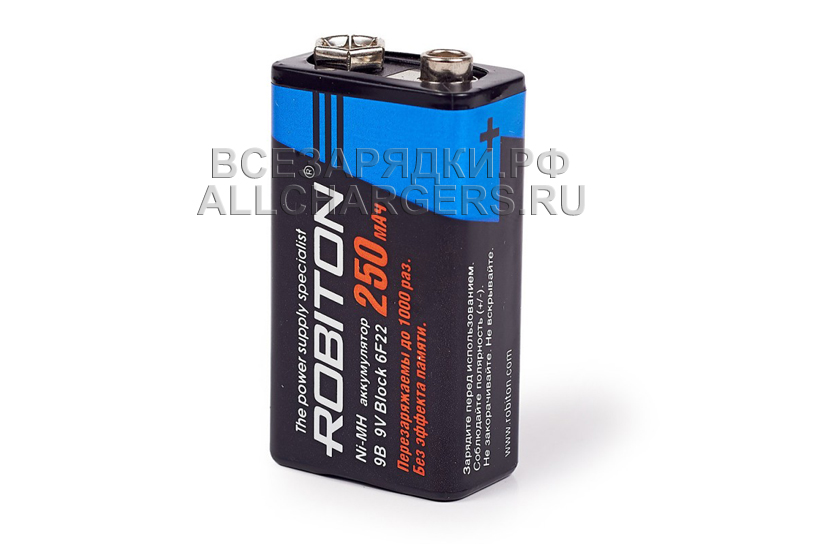 Аккумуляторная батарея типа 6F22 (Крона, 1604, 1604A, 6LF22, 6LR61, 6R61, CR-9V, MN1604, MX1604), 9V, 250mAh, Robiton, для различного оборудования