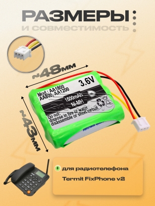 Аккумуляторная батарея (AA800, AA1200, AA1500, AA1800), 3.6V, Ni-MH, для стационарного GSM радио телефона Termit FixPhone v2