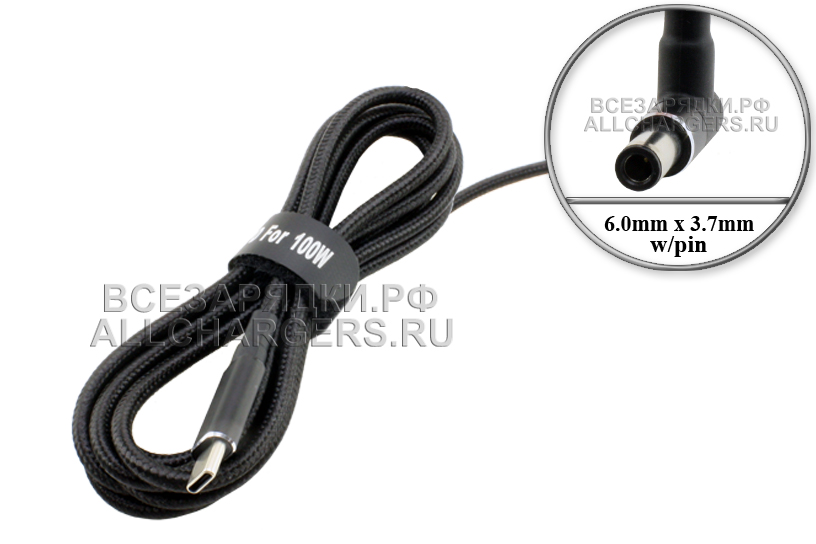 Переходник (конвертер) USB Type-C, male - 19V - 20V, 6.0mm x 3.7mm (3mm) 1pin, 100W, кабель, для зарядки ноутбука ASUS ROG Zephyrus; ZenBook Pro Duo и др. от адаптера питания или внешнего аккумулятора (powerbank) с выходом USB Type-C (Power Delivery)