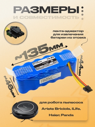 Аккумуляторная батарея (BTG110, BTX500), 14.4V, Ni-MH, усил. емк., для робота пылесоса Ariete Briciola 2711, 2712, 2713, 2717; iLife 3500; Haier SWR-T320, T321, T322, T325; Kitfort KT-503, KT-504, KT-516; Panda X500, X580 и др.